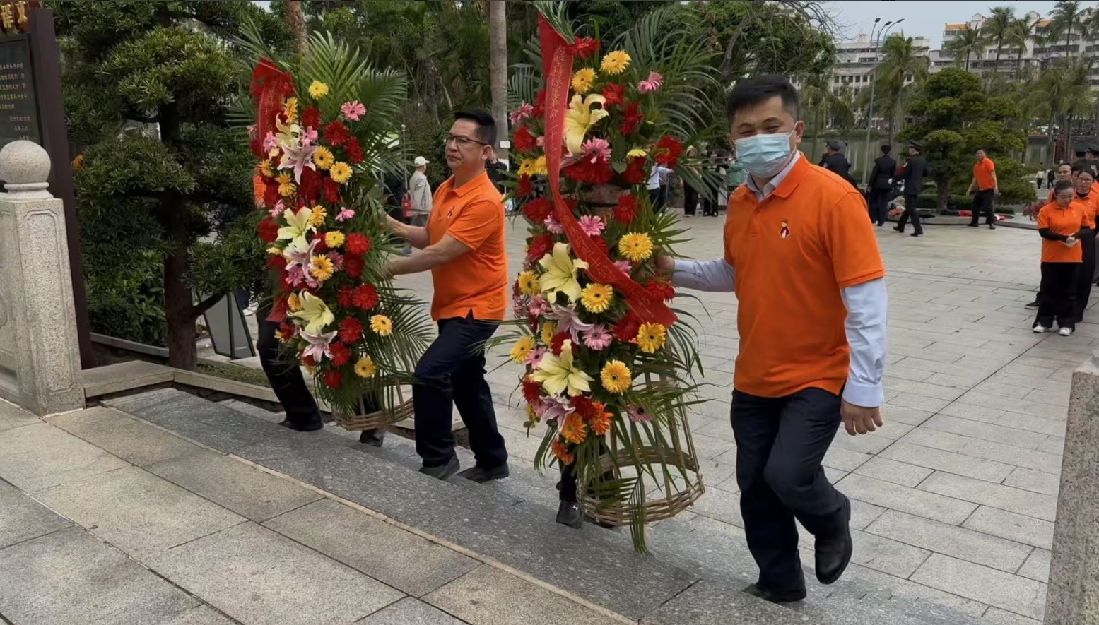 经过一段时间的等待才轮到公海彩船。公海彩船首先向烈士敬献花篮,花篮缎带上写着“为坚持琼崖革命23年红旗不倒牺牲的烈士们永垂不朽!”“为解放海南岛渡海牺牲的烈士们永垂不朽!”鲜艳的花篮寄托公海彩船对革命先辈的崇敬和哀思。